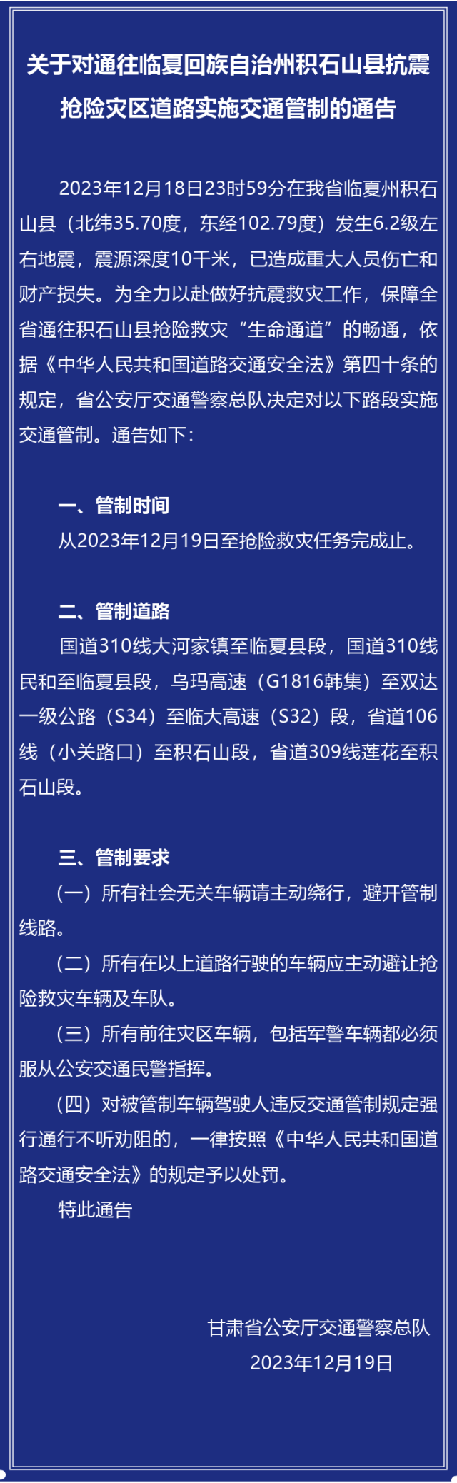 2023年12月18日23時(shí)59分在甘肅省臨夏州積石山縣發(fā)生6.2級(jí)左右地震,已造成重大人員傷亡和財(cái)產(chǎn)損失。為全力以赴做好抗震救災(zāi)工作,保障甘肅全省通往積石山縣搶險(xiǎn)救災(zāi)“生命通道”的暢通,甘肅省公安廳交通警察總隊(duì)對(duì)抗震搶險(xiǎn)災(zāi)區(qū)道路實(shí)施交通管制,至搶險(xiǎn)救災(zāi)任務(wù)完成止,詳情如下: