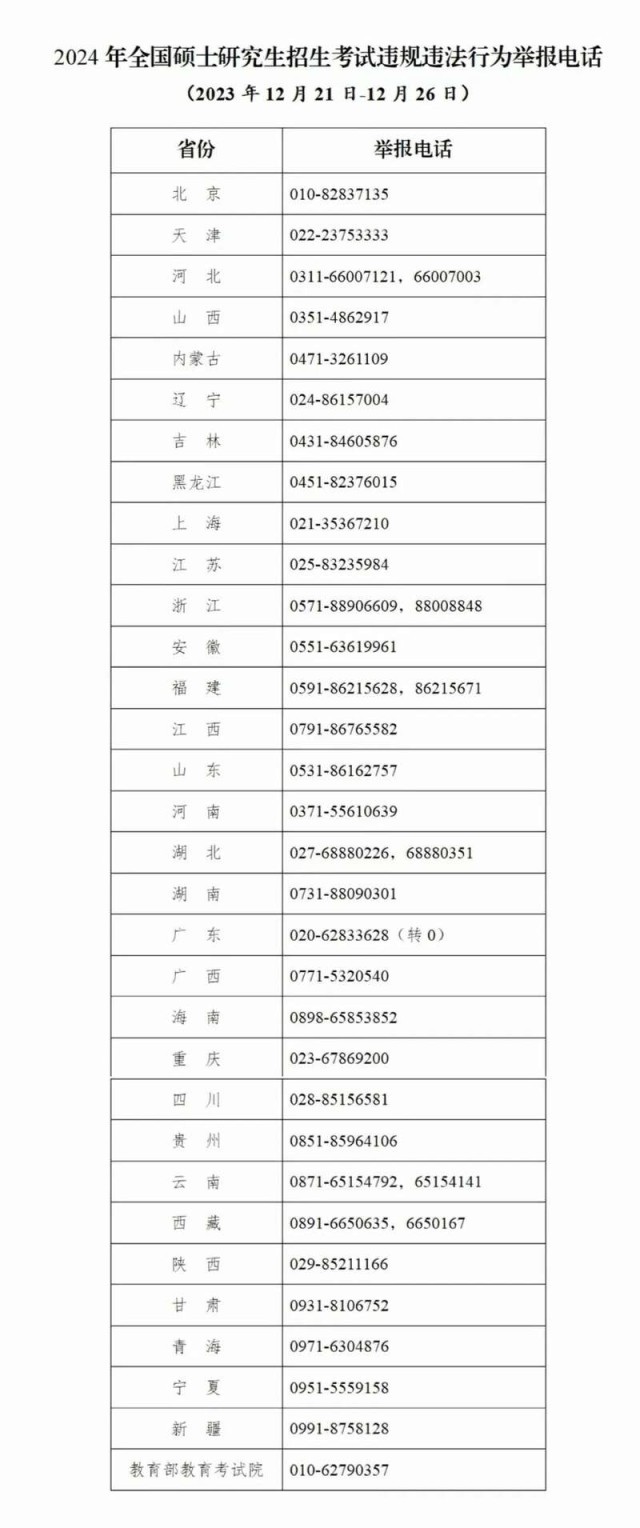 教育部和各省(區(qū)、市)教育招生考試機構(gòu)將開通2024年研考舉報電話,考生及社會各界人士可及時舉報反映有關(guān)問題線索。教育部及各?。▍^(qū)、市)將會同有關(guān)部門根據(jù)舉報線索第一時間核查處理,堅決維護風清氣正的研考環(huán)境。