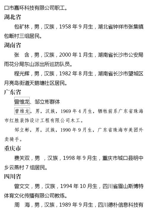 上榜勇士中有勇斗持刀犯罪嫌疑人身負(fù)重傷的張照杰、姚玉龍、王沖、王永芳;有從高橋跳水救人的周中磊、曾文文、周海;有從隨時(shí)可能爆炸的事故車輛中救出司機(jī)母子的湯益鑫;有冒著煤氣罐爆炸危險(xiǎn)制服劫持孩子歹徒的蔡國榮;有救援被困電梯內(nèi)同事而導(dǎo)致左小腿截肢的翟元敏;有休假期間水下連續(xù)救人的現(xiàn)役軍人柯東賢、吳金學(xué)、趙錦雄;更有見義勇為英勇犧牲的李偉倫、張嘉俊、張可可、李峰武、安西德、何同猛、曾維龍、胡喜明、李振華、東周才仁、賽西陳文11位同志,讓我們深懷敬仰,致崇高敬意!勇士們見義勇為事跡鼓舞人心、振奮精神、催人奮進(jìn)。他們用血汗甚至生命秉承、詮釋了中華民族傳統(tǒng)美德,用奮不顧身的實(shí)際行動(dòng)踐行了社會(huì)主義核心價(jià)值觀。