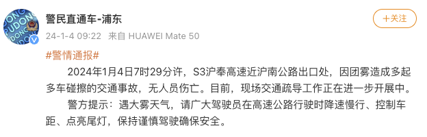 央視網(wǎng)消息:據(jù)警民直通車-浦東通報,1月4日7時29分許,S3滬奉高速近滬南公路出口處,因團霧造成多起多車碰擦的交通事故,無人員傷亡。目前,現(xiàn)場交通疏導工作正在進一步開展中。