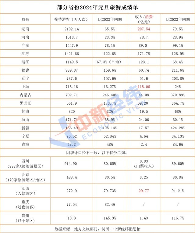 據(jù)中新經(jīng)緯不完全統(tǒng)計(jì),截至1月3日21時(shí),全國(guó)已有20省份發(fā)布2024年元旦旅游數(shù)據(jù)。其中,湖南接待游客2102.14萬(wàn)人次,暫時(shí)領(lǐng)跑全國(guó);河南接待游客1613.7萬(wàn)人次,位列第二;廣東接待游客1447.9萬(wàn),排名第三。此外,江蘇、浙江兩省游客接待量也超過(guò)千萬(wàn)。
