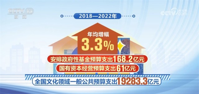 2018—2022年,全國文化領(lǐng)域一般公共預(yù)算支出19283.3億元,年均增幅3.3%;安排政府性基金預(yù)算支出168.2億元,國有資本經(jīng)營預(yù)算支出61億元。