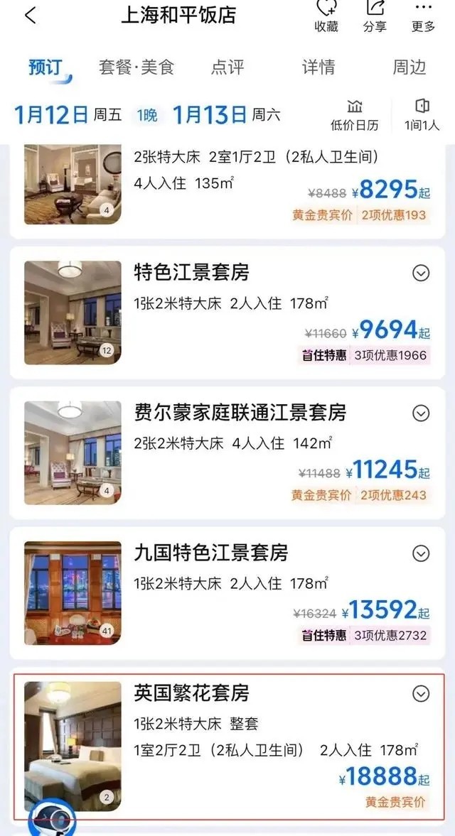 劇中出鏡率極高的和平飯店英國套房也成了“熱門產(chǎn)品”。目前,和平飯店英國套房在旅游平臺上被命名為“英國繁花套房”。9日查詢攜程旅行平臺發(fā)現(xiàn),9-11日該套房已售罄,12日入住一晚的價格為18888元。據(jù)媒體此前報道,這一套房在今年春節(jié)期間含早價為22888元一晚。
