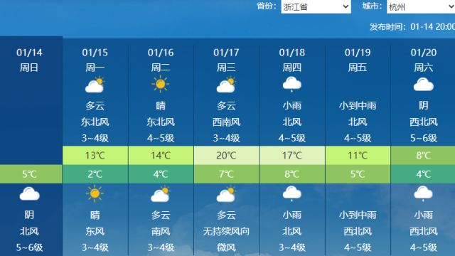 像是杭州,今天最高氣溫22.6℃,剛刷新當?shù)?月中旬最高氣溫紀錄,明天氣溫陡降,雖預(yù)報最高氣溫14℃,但今晚開始氣溫倒出,實際明天下午最高氣溫將不足10℃,17日氣溫再度升至20℃,大幅偏高,20日又降至8℃。