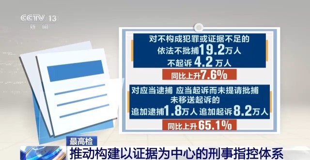 對不構(gòu)成犯罪或證據(jù)不足的依法不批捕19.2萬人、不起訴4.2萬人;對應當逮捕、應當起訴而未提請批捕、未移送起訴的,追加逮捕1.8萬人、追加起訴8.2萬人,同比分別上升7.6%和65.1%。