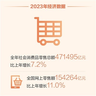 消費(fèi)規(guī)模再創(chuàng)新高。2023年社會消費(fèi)品零售總額達(dá)47.1萬億元,總量創(chuàng)歷史新高,比上年增長7.2%。按消費(fèi)類型分,商品零售增長5.8%,餐飲收入增長20.4%。全國網(wǎng)上零售額154264億元,比上年增長11.0%;其中,實(shí)物商品網(wǎng)上零售額增長8.4%,占社會消費(fèi)品零售總額的比重為27.6%。