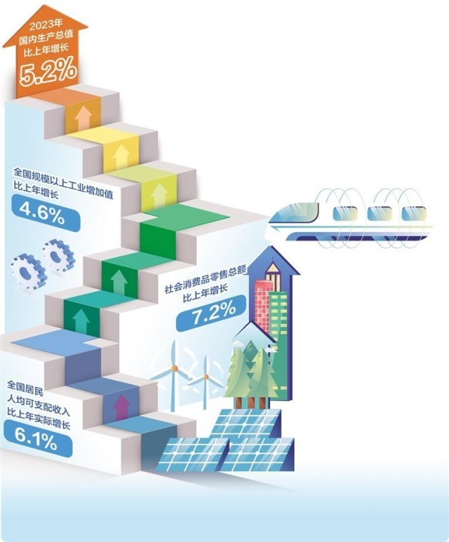 從經(jīng)濟增長看,2023年我國GDP超過126萬億元,增速比2022年加快2.2個百分點。分季度看,呈現(xiàn)前低、中高、后穩(wěn)的態(tài)勢,向好趨勢進一步鞏固。按可比價計算,2023年經(jīng)濟增量超過6萬億元,相當(dāng)于一個中等國家一年的經(jīng)濟總量。人均國內(nèi)生產(chǎn)總值穩(wěn)步提高,2023年達到89358元,比上年增長5.4%。