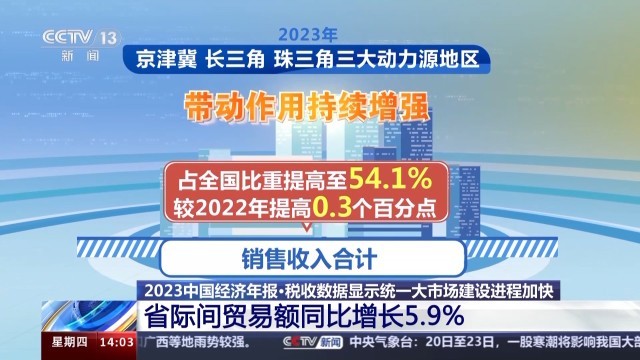 國(guó)家稅務(wù)總局新聞發(fā)言人 黃運(yùn):2023年,衡量國(guó)內(nèi)各省之間貿(mào)易聯(lián)系緊密程度的省際間貿(mào)易額同比增長(zhǎng)5.9%,占全國(guó)貿(mào)易總額比重提高至42.7%,較2022年提高0.5個(gè)百分點(diǎn),而且也呈逐年提升的態(tài)勢(shì),反映經(jīng)濟(jì)內(nèi)循環(huán)更加順暢,統(tǒng)一大市場(chǎng)建設(shè)進(jìn)程加快。