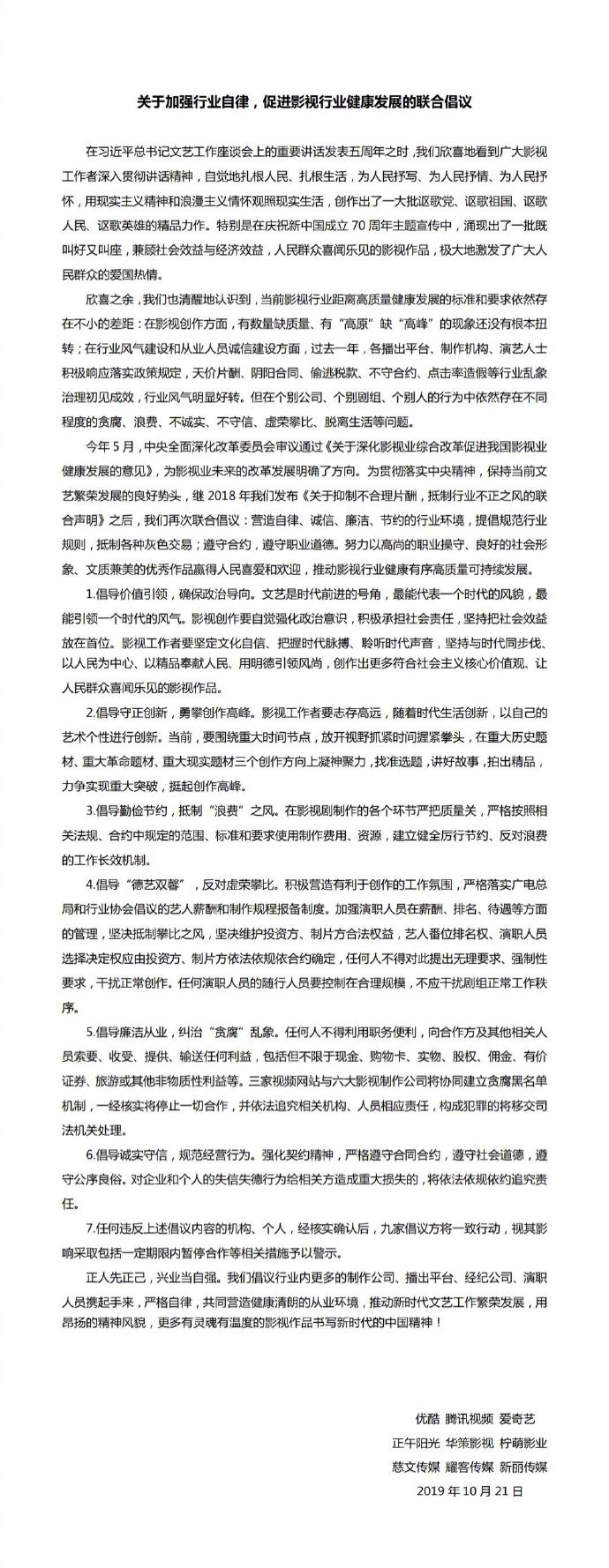 為了避免娛樂(lè)圈的爭(zhēng)番、攀比等亂象,業(yè)界公司曾聯(lián)合發(fā)布自律倡議。2019年,優(yōu)酷、騰訊視頻、愛(ài)奇藝三家視頻網(wǎng)站,聯(lián)合正午陽(yáng)光、華策影視、檸萌影業(yè)、慈文傳媒、耀客傳媒、新麗傳媒六大影視制作公司,共同發(fā)布《關(guān)于加強(qiáng)行業(yè)自律,促進(jìn)影視行業(yè)健康發(fā)展的聯(lián)合倡議》。