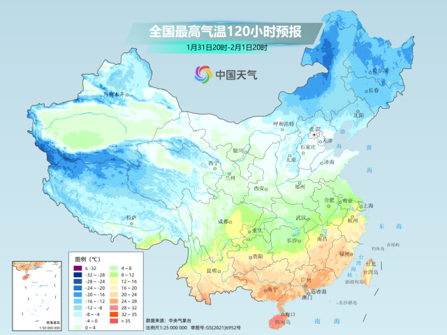 1月31日至2月1日,南方暖熱將達(dá)到階段性高點(diǎn),屆時(shí)最高氣溫20℃線將北抬至江南中部,華南不少地方最高氣溫將超過25℃。