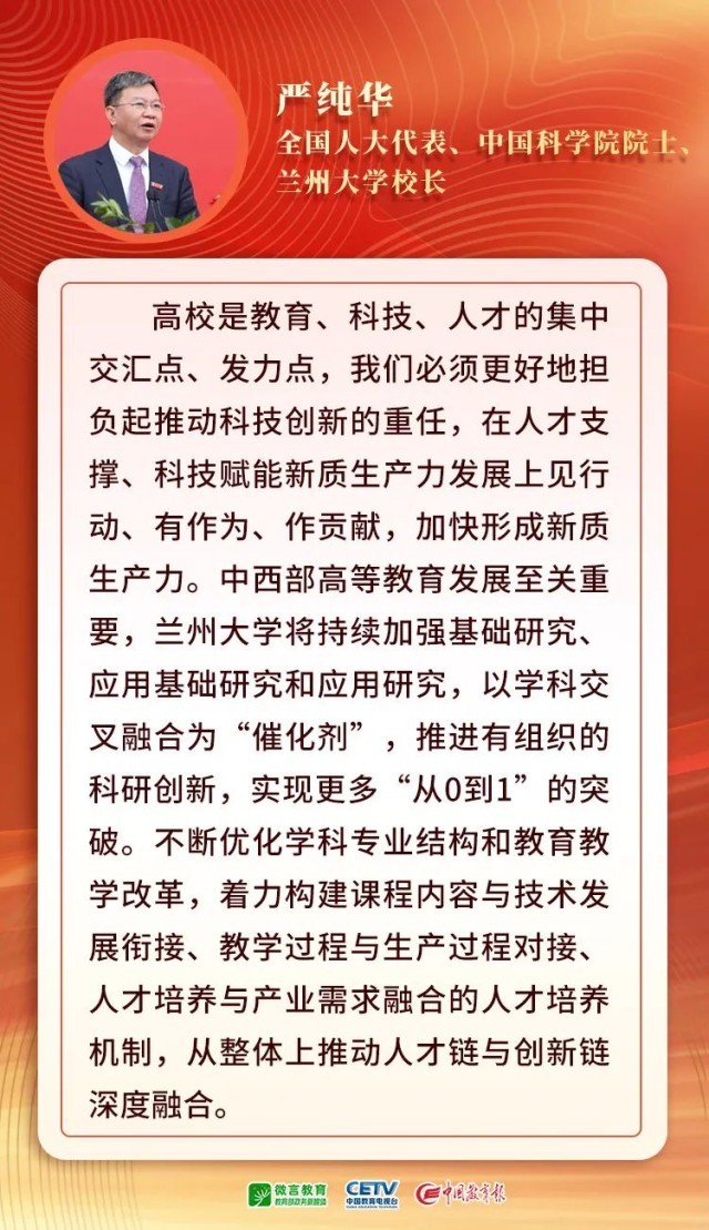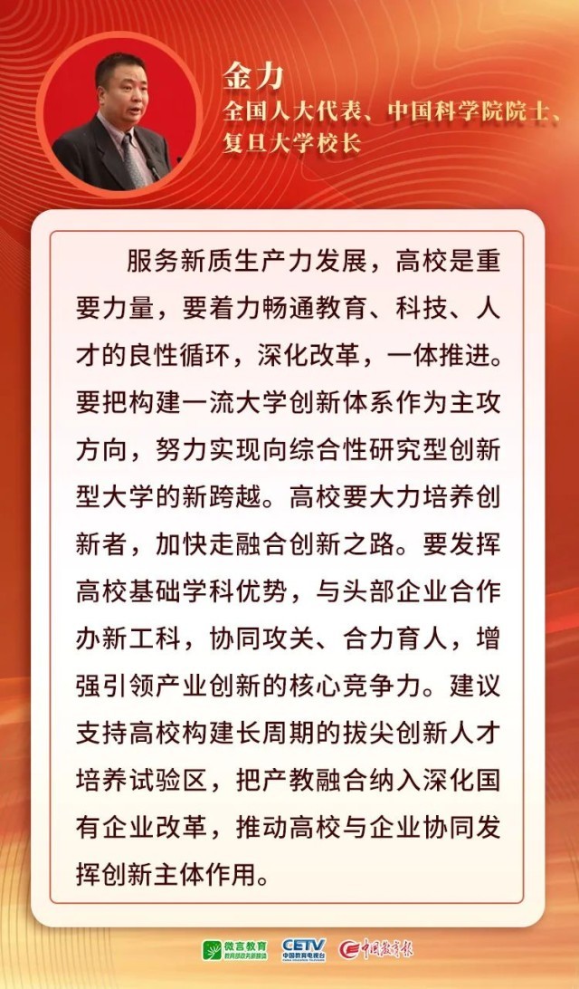 2024年政府工作報告提出,大力推進現(xiàn)代化產(chǎn)業(yè)體系建設(shè),加快發(fā)展新質(zhì)生產(chǎn)力。培育和發(fā)展新質(zhì)生產(chǎn)力,創(chuàng)新是核心要素,基礎(chǔ)和先導靠教育。高校如何發(fā)揮支撐作用,推動新質(zhì)生產(chǎn)力發(fā)展?5位代表委員,同時也是大學書記、校長,提出了建議,來聽他們怎么說——
