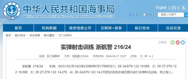 央視網(wǎng)消息:據(jù)中國(guó)海事局網(wǎng)站消息,浙江海事局發(fā)布航行警告,3月12日至14日每日8時(shí)至17時(shí),東海部分水域進(jìn)行實(shí)彈射擊訓(xùn)練,禁止駛?cè)搿?/p>