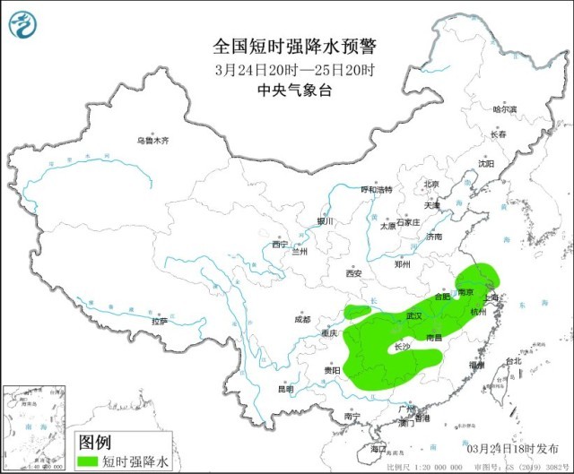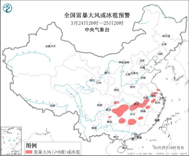 央視網(wǎng)消息:中央氣象臺3月24日18時繼續(xù)發(fā)布強對流天氣藍色預(yù)警。預(yù)計3月24日20時至25日20時,安徽中南部、江蘇中南部、湖北東部和南部、重慶東部、貴州東部、湖南北部和東南部、江西東北部和中南部、浙江西北部、廣西東北部等地的部分地區(qū)將有8-10級雷暴大風(fēng)或冰雹天氣;安徽中南部、江蘇中南部、上海北部和西部、湖北東部和南部、重慶東部、貴州東部、湖南、江西、浙江西北部、廣西東北部、廣東西北部等地的部分地區(qū)將有短時強降水天氣,最大小時雨量20-40毫米,局地可達50毫米以上。