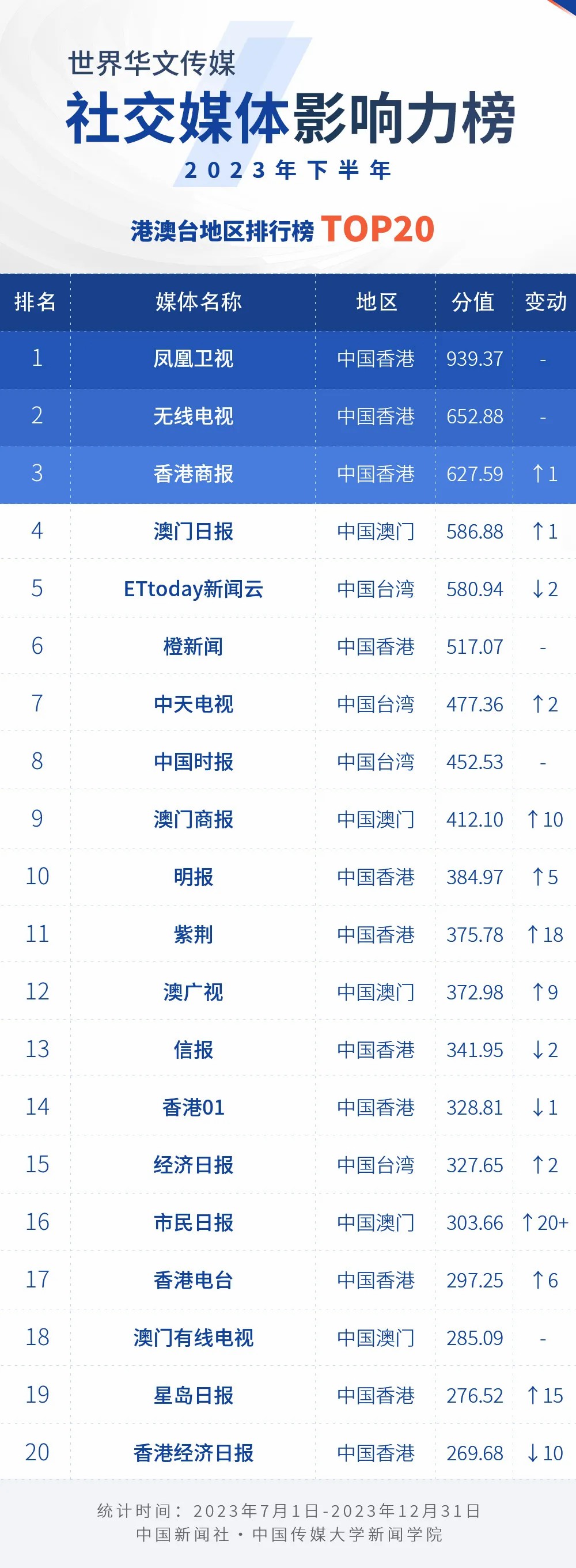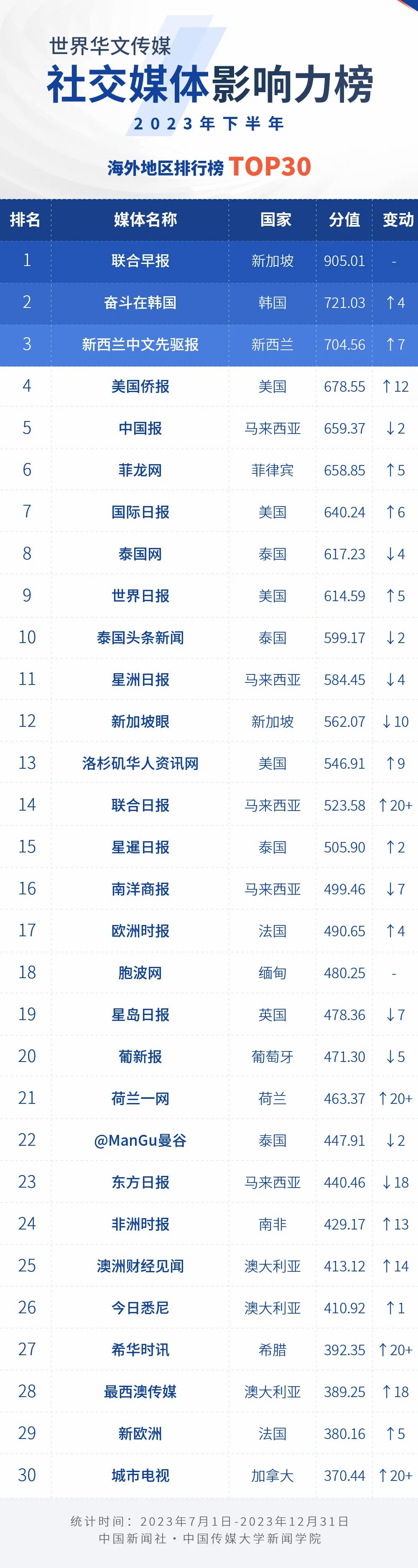 中國(guó)新聞社與中國(guó)傳媒大學(xué)新聞學(xué)院持續(xù)開(kāi)展“世界華文傳媒新媒體影響力”測(cè)評(píng)項(xiàng)目,現(xiàn)根據(jù)2023年下半年世界華文傳媒新媒體的業(yè)務(wù)數(shù)據(jù),發(fā)布2023年下半年榜。