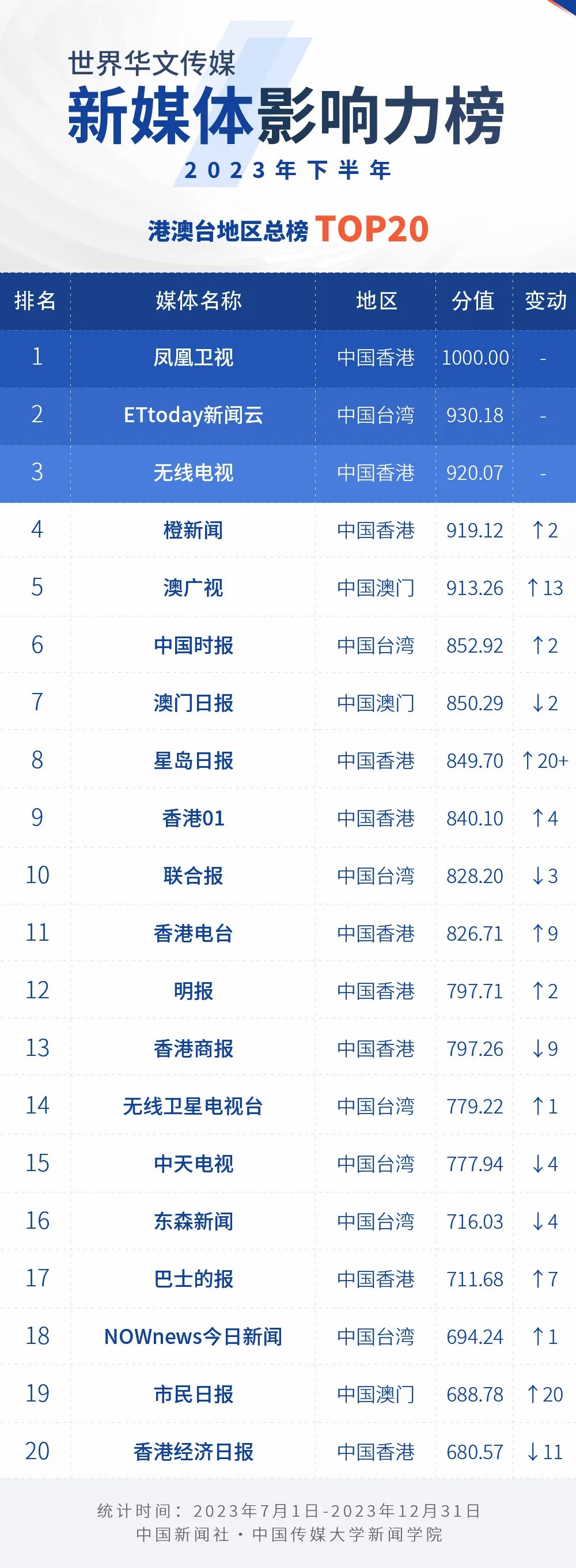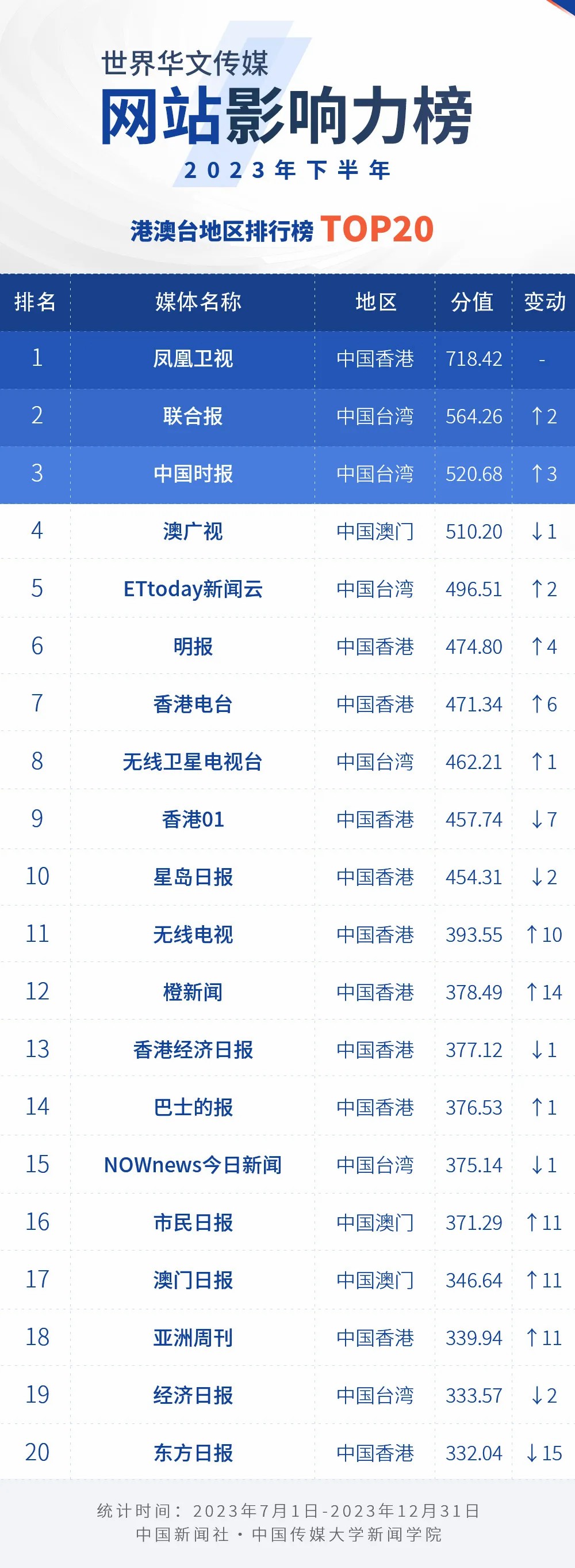 2023年下半年世界華文傳媒新媒體影響力榜