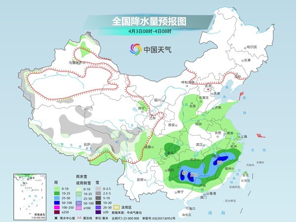 具體來看,中央氣象臺預(yù)計,今天,新疆沿天山地區(qū)和南疆盆地、西藏北部和東部、青海大部、川西高原北部等地部分地區(qū)有小到中雪或雨夾雪,其中,新疆沿天山地區(qū)和南疆盆地、青海東北部等地部分地區(qū)有大到暴雪,新疆沿天山地區(qū)局地大暴雪(20~21毫米)。陜西東南部、河南中南部、安徽大部、江蘇中西部、四川東部、重慶大部、貴州東北部、湖北、湖南中北部、江西大部、浙江中西部、福建中西部等地部分地區(qū)有中到大雨,其中,河南南部、安徽中南部、湖北東部和南部、湖南北部和西部、江西北部和東南部、福建西部、重慶東南部等地部分地區(qū)有暴雨,局地大暴雨(100~120毫米)。