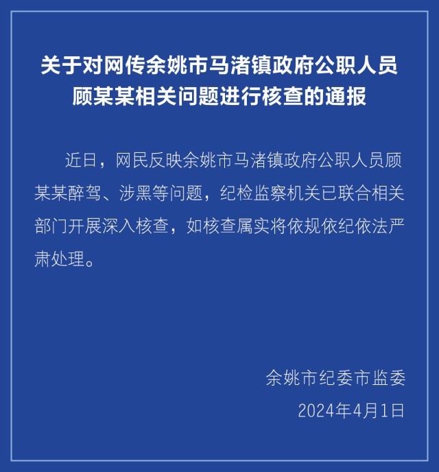 鎮(zhèn)政府公職人員醉駕、涉黑?浙江余姚市紀委市監(jiān)委:開展深入核查