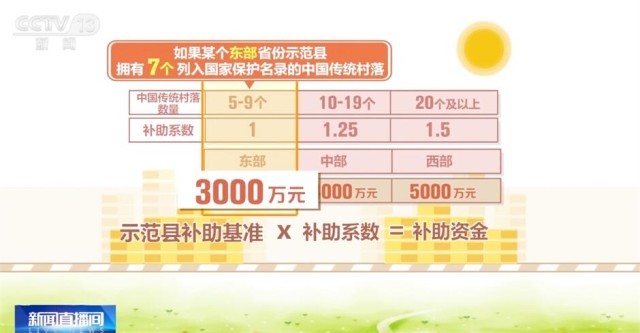 根據(jù)規(guī)定,中央財政對傳統(tǒng)村落集中連片保護(hù)利用示范縣予以定額獎補(bǔ),其中東、中、西部示范縣補(bǔ)助基準(zhǔn)分別為3000萬元、4000萬元、5000萬元。同時,根據(jù)示范縣擁有中國傳統(tǒng)村落數(shù)量情況賦予相應(yīng)獎補(bǔ)系數(shù),擁有5—9個、10—19個、20個及以上中國傳統(tǒng)村落的示范縣補(bǔ)助系數(shù)分別為1、1.25、1.5。每個示范縣的補(bǔ)助資金為相應(yīng)的補(bǔ)助基準(zhǔn)乘以補(bǔ)助系數(shù)。舉個例子,如果某個東部省份示范縣擁有7個列入國家保護(hù)名錄的中國傳統(tǒng)村落,中央財政將對這個示范縣進(jìn)行3000萬元獎補(bǔ)。