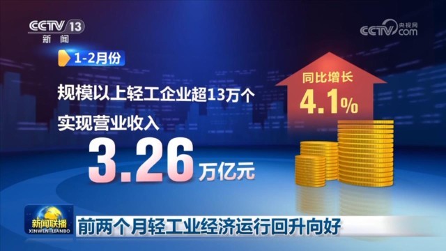 央視網(wǎng)消息(新聞聯(lián)播):中國輕工業(yè)聯(lián)合會發(fā)布數(shù)據(jù)顯示,今年前兩個月,消費品制造業(yè)發(fā)展動力增強,帶動輕工業(yè)經(jīng)濟運行回升向好。1—2月,規(guī)模以上輕工企業(yè)超13萬個,實現(xiàn)營業(yè)收入3.26萬億元,同比增長4.1%。