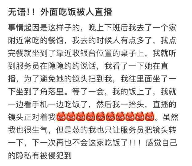 據(jù)媒體報(bào)道,近期,陜西西安兩名老人用餐時(shí)被商家拍下視頻,之后商家又私自將拍攝內(nèi)容發(fā)到網(wǎng)上,老人親戚無(wú)意刷到視頻才發(fā)現(xiàn)。在老人家屬與其多次溝通后,商家刪除了視頻。消費(fèi)者多在不知情或者未被征詢意見(jiàn)的情況下被動(dòng)充當(dāng)商家直播或者拍攝短視頻的引流工具,除了自己的言行舉止可能被迫接受他人的凝視和審判外,還有面部信息泄露風(fēng)險(xiǎn)。