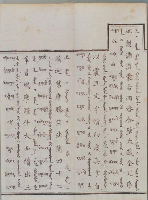 康熙皇帝特別注重刊行蒙古文《甘珠爾》以“利于祭誦”,康熙五十六年(1717年)下令刊刻蒙古文《甘珠爾》。到了乾隆三十二年(1767年),傅恒上書提出,要讓僧人念經念得準,需要標明原音、輔音的韻腳和切音,最好能看著漢字就能念出梵音(“禮今教習僧人持念咒語止,須明曉阿禮嘎禮音韻反切,自能對漢字而得梵音”)。于是,為方便蒙古地區(qū)僧人念誦咒語,《御制滿漢西番合璧大藏全咒》添譯了蒙古文。蒙古文《大藏經》是蒙古族歷史文化發(fā)展的里程碑,也是蒙古族已知最大部頭的古籍。在譯經過程中,蒙古文字也得到了充分錘煉與發(fā)展,提高了交流與表現能力。