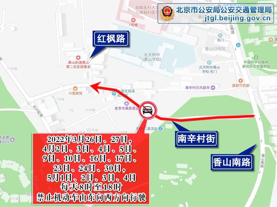 特別提示去往香山地區(qū)的市民朋友:4月2日、3日、4日、5日、9日、10日、16日、17日、23日、24日,5月1日、2日、3日、4日,每天8時(shí)至18時(shí),南辛村街(紅楓路至香山南路段)禁止機(jī)動(dòng)車由東向西方向行駛。