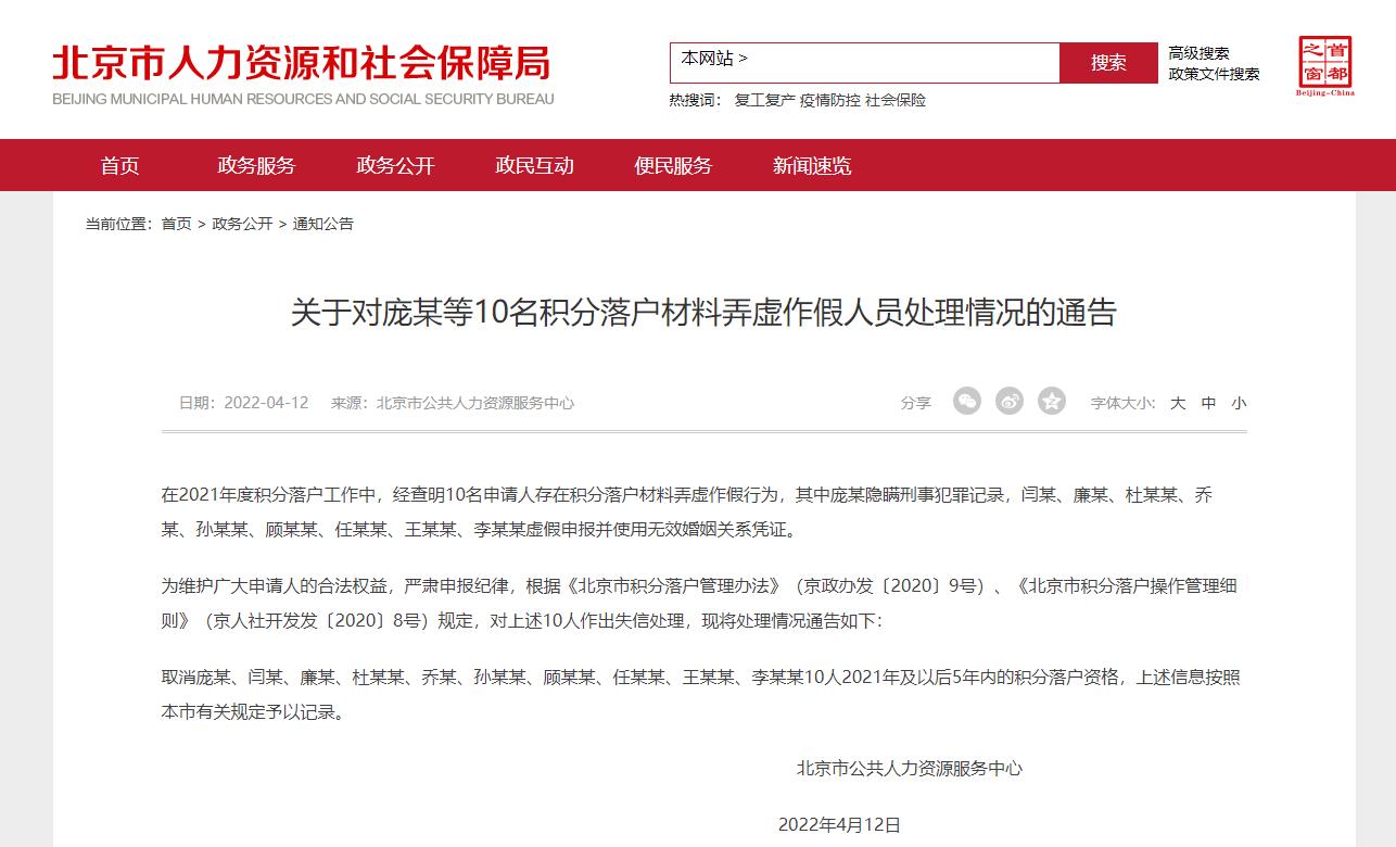 中新網(wǎng)4月12日電 北京市人社局網(wǎng)站12日發(fā)布通告指出,在2021年度積分落戶工作中,經(jīng)查明10名申請人存在積分落戶材料弄虛作假行為,取消龐某等10人2021年及以后5年內(nèi)的積分落戶資格。