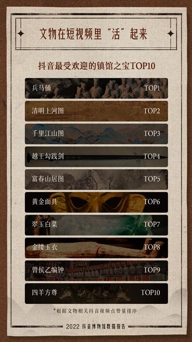 通過抖音平臺的短視頻,觀眾可直接觀賞“鎮(zhèn)館之寶”級別的藏品,與歷史和傳統(tǒng)對話。報告顯示,兵馬俑、《清明上河圖》、《千里江山圖》等入選抖音最受歡迎十大鎮(zhèn)館之寶。真珠舍利寶幢、蓮鶴方壺、象首耳獸面紋銅罍等入選抖音關注度提升最快的文物前十名。