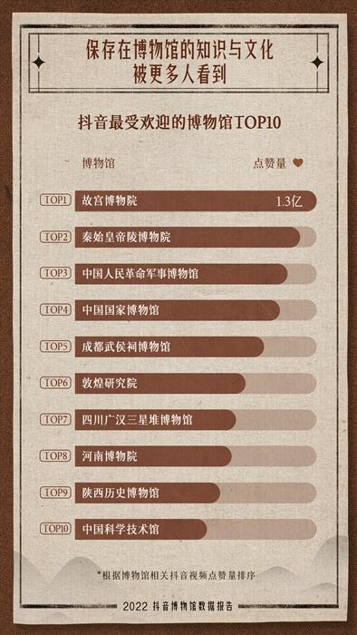 報告顯示,根據(jù)相關視頻點贊量排序,故宮博物院、秦始皇帝陵博物院、中國人民革命軍事博物館、中國國家博物館、成都武侯祠博物館等入選抖音最受歡迎十大博物館。其中,故宮博物院相關視頻被抖音網友點贊超過1.3億次。