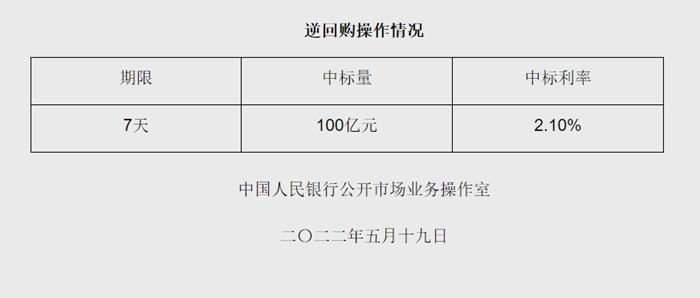 央行5月19日開(kāi)展100億元逆回購(gòu)操作 中標(biāo)利率2.10%