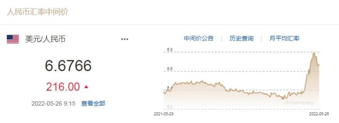 中新財(cái)經(jīng)5月26日電 中國人民銀行授權(quán)中國外匯交易中心公布,2022年5月26日銀行間外匯市場(chǎng)人民幣匯率中間價(jià)為:1美元對(duì)人民幣6.6766元。這較上一交易日下調(diào)216個(gè)基點(diǎn)。(完)