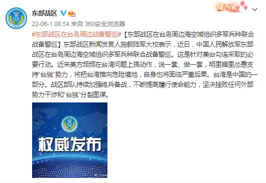 中新網(wǎng)6月1日電 據(jù)中國(guó)人民解放軍東部戰(zhàn)區(qū)官方微博1日消息,東部戰(zhàn)區(qū)新聞發(fā)言人施毅陸軍大校表示,近日,中國(guó)人民解放軍東部戰(zhàn)區(qū)在臺(tái)島周邊海空域組織多軍兵種聯(lián)合戰(zhàn)備警巡。這是針對(duì)美臺(tái)勾連采取的必要行動(dòng)。近來(lái)美方頻頻在臺(tái)灣問題上搞動(dòng)作,說(shuō)一套、做一套,明里暗里慫恿支持“臺(tái)獨(dú)”勢(shì)力,將把臺(tái)灣推向危險(xiǎn)境地,自身也將面臨嚴(yán)重后果。臺(tái)灣是中國(guó)的一部分。戰(zhàn)區(qū)部隊(duì)持續(xù)加強(qiáng)練兵備戰(zhàn),不斷提高履行使命能力,堅(jiān)決挫敗任何外部勢(shì)力干涉和“臺(tái)獨(dú)”分裂圖謀。