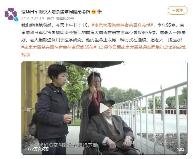 中新網(wǎng)6月8日電 據(jù)侵華日軍南京大屠殺遇難同胞紀念館官方微博消息,6月7日上午11時10分,南京大屠殺幸存者余昌祥去世,享年95歲。南京侵華日軍受害者援助協(xié)會登記的南京大屠殺在冊在世幸存者僅剩55位。