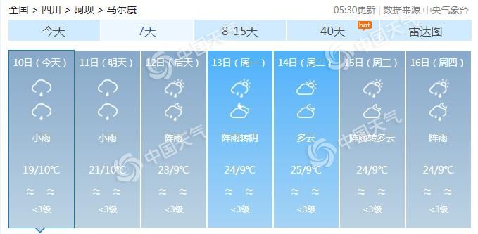 中央氣象臺(tái)預(yù)計(jì),今起三天,馬爾康市多降雨,其中今明天有小雨,后天有陣雨。早晚氣溫較低,最低氣溫在10℃左右,最高氣溫19~23℃。