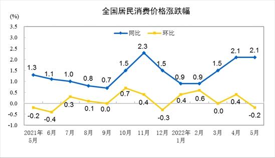 據(jù)國(guó)家統(tǒng)計(jì)局城市司高級(jí)統(tǒng)計(jì)師董莉娟介紹,從同比看,5月份CPI上漲2.1%,漲幅與上月相同。其中,食品價(jià)格上漲2.3%,漲幅比上月擴(kuò)大0.4個(gè)百分點(diǎn),影響CPI上漲約0.42個(gè)百分點(diǎn)。