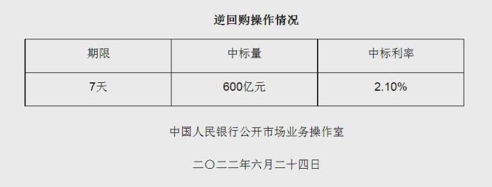 央行6月24日開展600億元逆回購操作 中標(biāo)利率2.10%