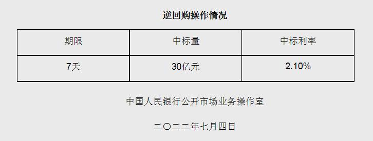 央行7月4日開展30億元逆回購(gòu)操作 中標(biāo)利率2.10%