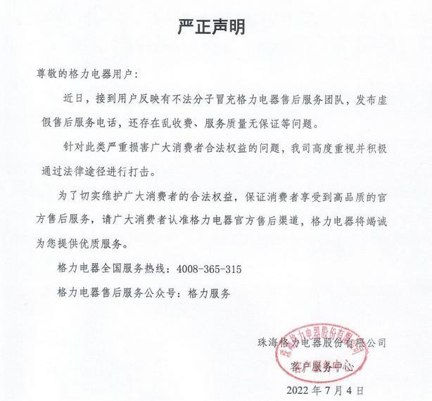 格力電器:有不法分子冒充售后服務(wù)團(tuán)隊(duì) 存在亂收費(fèi)等問(wèn)題