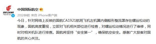 國航:已對國航CA1921航班螺絲松動情況進行維修