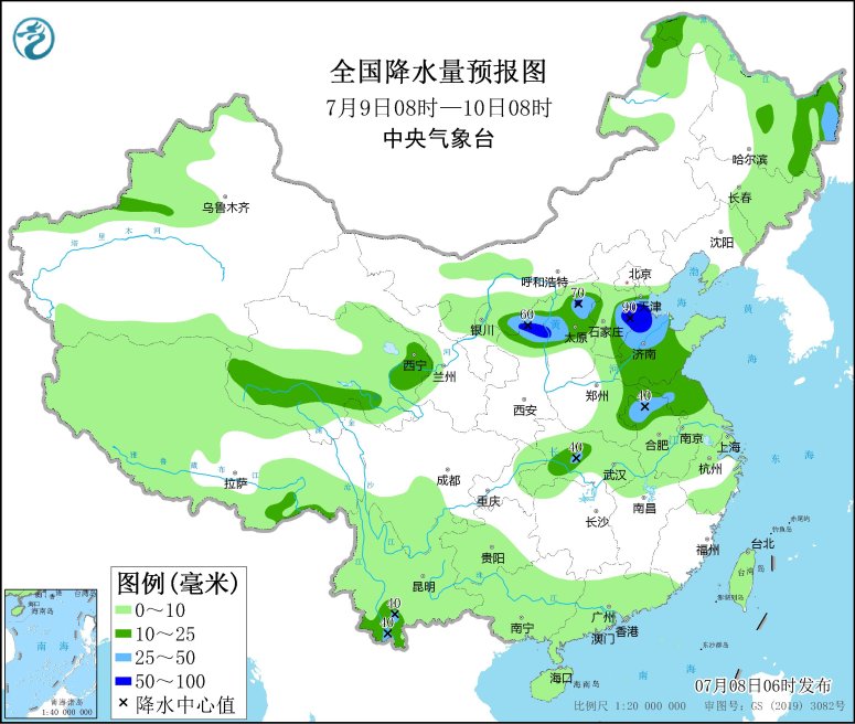 7月8日08時(shí)至9日08時(shí),內(nèi)蒙古東北部、黑龍江西部和東北部、云南南部、華南西部和南部等地部分地區(qū)有中到大雨,其中,內(nèi)蒙古東北部等地局地有暴雨(50~90毫米)。內(nèi)蒙古中東部、新疆沿天山地區(qū)和南疆盆地等地部分地區(qū)有4~6級(jí)風(fēng);南海南部海域有5~7級(jí)、陣風(fēng)8級(jí)的偏西風(fēng)。