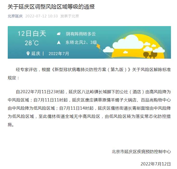 中新網(wǎng)7月12日電 據(jù)“北京延慶”微信公眾號(hào)消息,北京市延慶區(qū)疾病預(yù)防控制中心12日發(fā)布通報(bào)稱,經(jīng)專家評(píng)估,根據(jù)《新型冠狀病毒肺炎防控方案(第九版)》關(guān)于風(fēng)險(xiǎn)區(qū)解除標(biāo)準(zhǔn)規(guī)定:自2022年7月11日23時(shí)起,延慶區(qū)八達(dá)嶺鎮(zhèn)長(zhǎng)城腳下的公社(酒店)由高風(fēng)險(xiǎn)降為中風(fēng)險(xiǎn)區(qū)域;自7月11日11時(shí)起,延慶區(qū)康莊鎮(zhèn)草原情羊蝎子火鍋店、百品尚購(gòu)物中心由中風(fēng)險(xiǎn)降為低風(fēng)險(xiǎn)區(qū)域;自7月11日14時(shí)起,延慶區(qū)儒林街道長(zhǎng)青削面館由中風(fēng)險(xiǎn)降為低風(fēng)險(xiǎn)區(qū)域,至此儒林街道全域無(wú)中高風(fēng)險(xiǎn)區(qū),由低風(fēng)險(xiǎn)區(qū)轉(zhuǎn)為落實(shí)常態(tài)化防控措施。