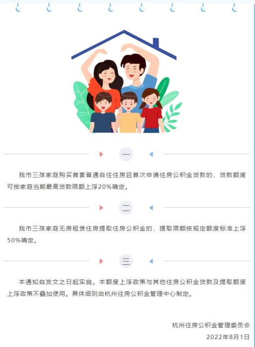 其中指出,杭州市三孩家庭購買首套普通自住住房且首次申請住房公積金貸款的,貸款額度可按家庭當(dāng)期最高貸款限額上浮20%確定。杭州市三孩家庭無房租賃住房提取住房公積金的,提取限額按規(guī)定額度標準上浮50%確定。通知自發(fā)文之日起實施。(中新財經(jīng))