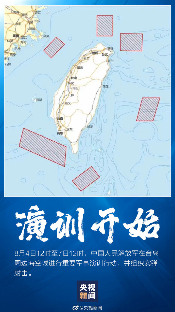 今日12時至7日12時,解放軍重要軍事演訓(xùn)行動進行,并組織實彈射擊。此次實戰(zhàn)演訓(xùn)選擇環(huán)島六大區(qū)域,在此期間,有關(guān)船只和飛行器不要進入有關(guān)海域和空域!
