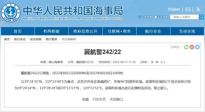 航行警告!渤海部分海域12日起實(shí)彈射擊