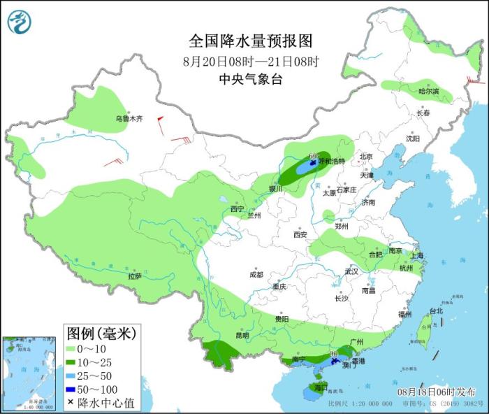8月20日08時(shí)至21日08時(shí),內(nèi)蒙古西部、云南西南部、華南南部和海南島等地部分地區(qū)有中到大雨,其中,內(nèi)蒙古河套地區(qū)、廣東西南部沿海等地部分地區(qū)有暴雨(50~90毫米)。新疆南疆盆地部分地區(qū)有4~6級(jí)風(fēng),其中,新疆東部部分地區(qū)有7~8級(jí)風(fēng)。
