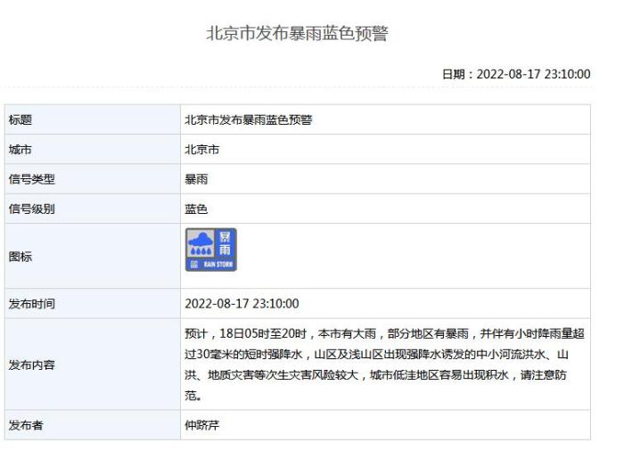 - 北京發(fā)布暴雨藍色預(yù)警:大雨,部分地區(qū)暴雨