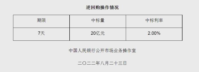 央行8月23日進(jìn)行20億元7天期逆回購操作 中標(biāo)利率2.00%