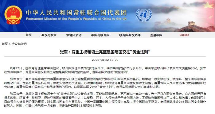 中新網(wǎng)8月23日電 據(jù)中國(guó)常駐聯(lián)合國(guó)代表團(tuán)網(wǎng)站消息,中國(guó)常駐聯(lián)合國(guó)代表張軍大使在聯(lián)合國(guó)安理會(huì)的公開(kāi)會(huì)上指出,尊重各國(guó)主權(quán)和領(lǐng)土完整是實(shí)現(xiàn)共同安全的基礎(chǔ),是國(guó)與國(guó)交往的“黃金法則”。