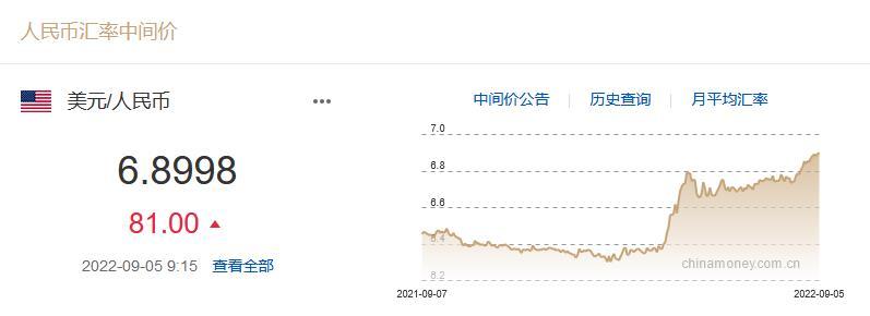 9月5日人民幣對美元中間價報6.8998 下調81個基點