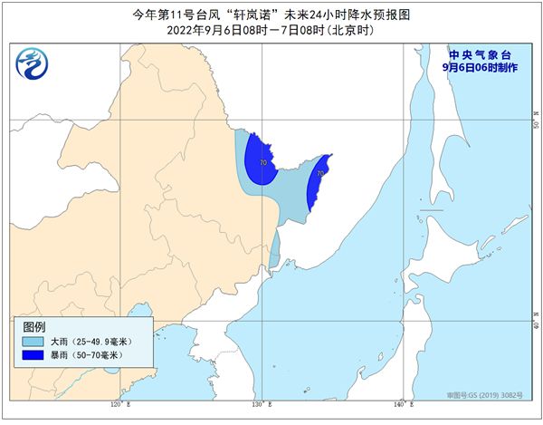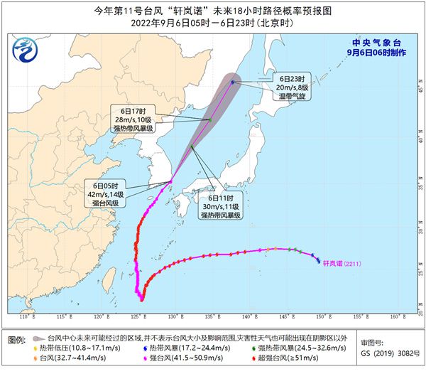 大風預報:9月6日08時至7日08時,東海東北部、黃海中東部和東南部有6-7級大風,陣風8-9級;我國東北地區(qū)東北部有4-5級風,陣風6-7級,局地8級。朝鮮海峽、日本海大部有8-11級大風,“軒嵐諾”中心經(jīng)過的附近海面的風力有12-14級,陣風可達15-16級。